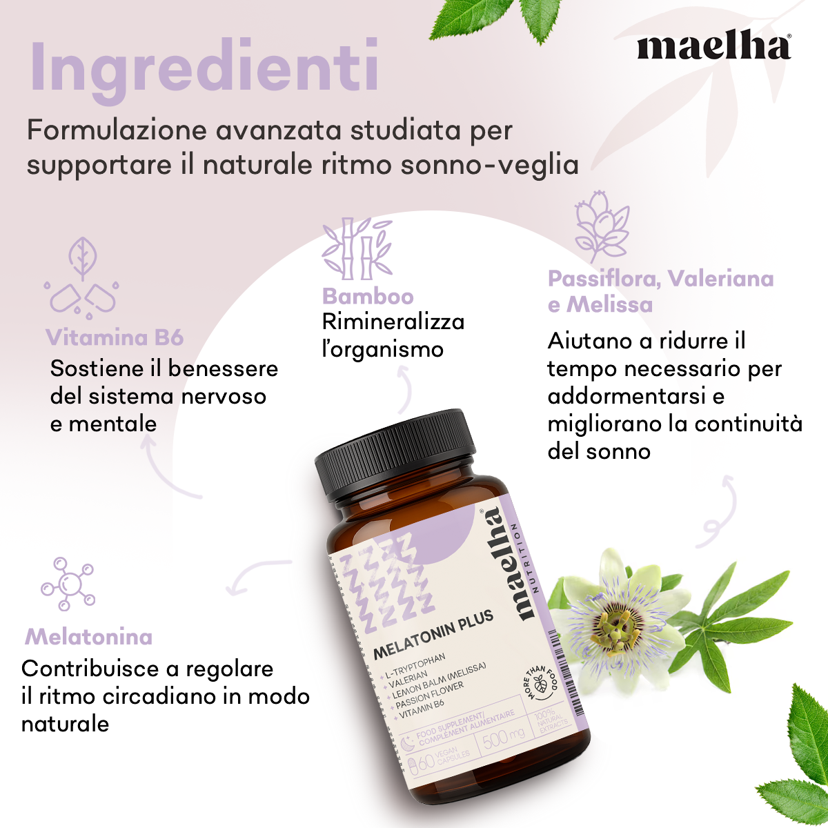 Inoltre, Melatonin Plus è arricchito con ingredienti naturali come il L-triptofano, l'estratto di Valeriana, Passiflora e Melissa, tutti noti per le loro proprietà calmanti e rilassanti. Questi ingredienti non solo favoriscono un sonno più profondo, ma contribuiscono anche a ridurre lo stress e l'ansia, fattori spesso responsabili di problemi legati al sonno. Questo lo rende ideale per chi cerca integratori valeriana, integratori naturali per il sonno o un prodotto che combini melatonina e valeriana per dormire.