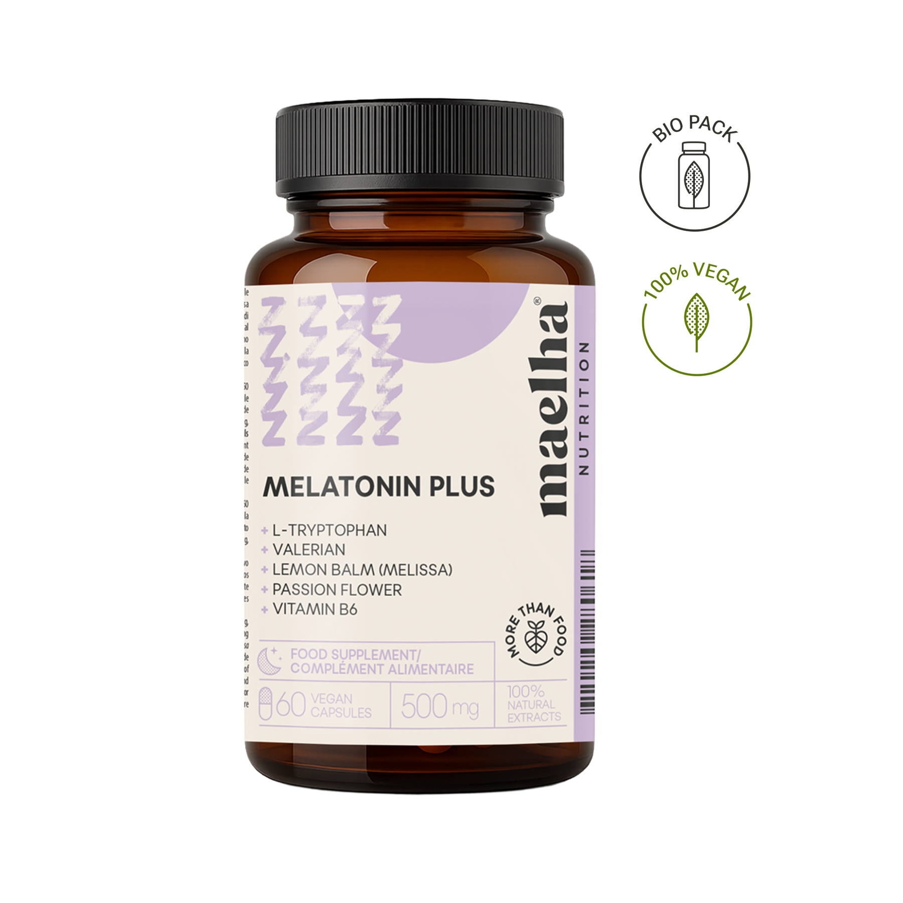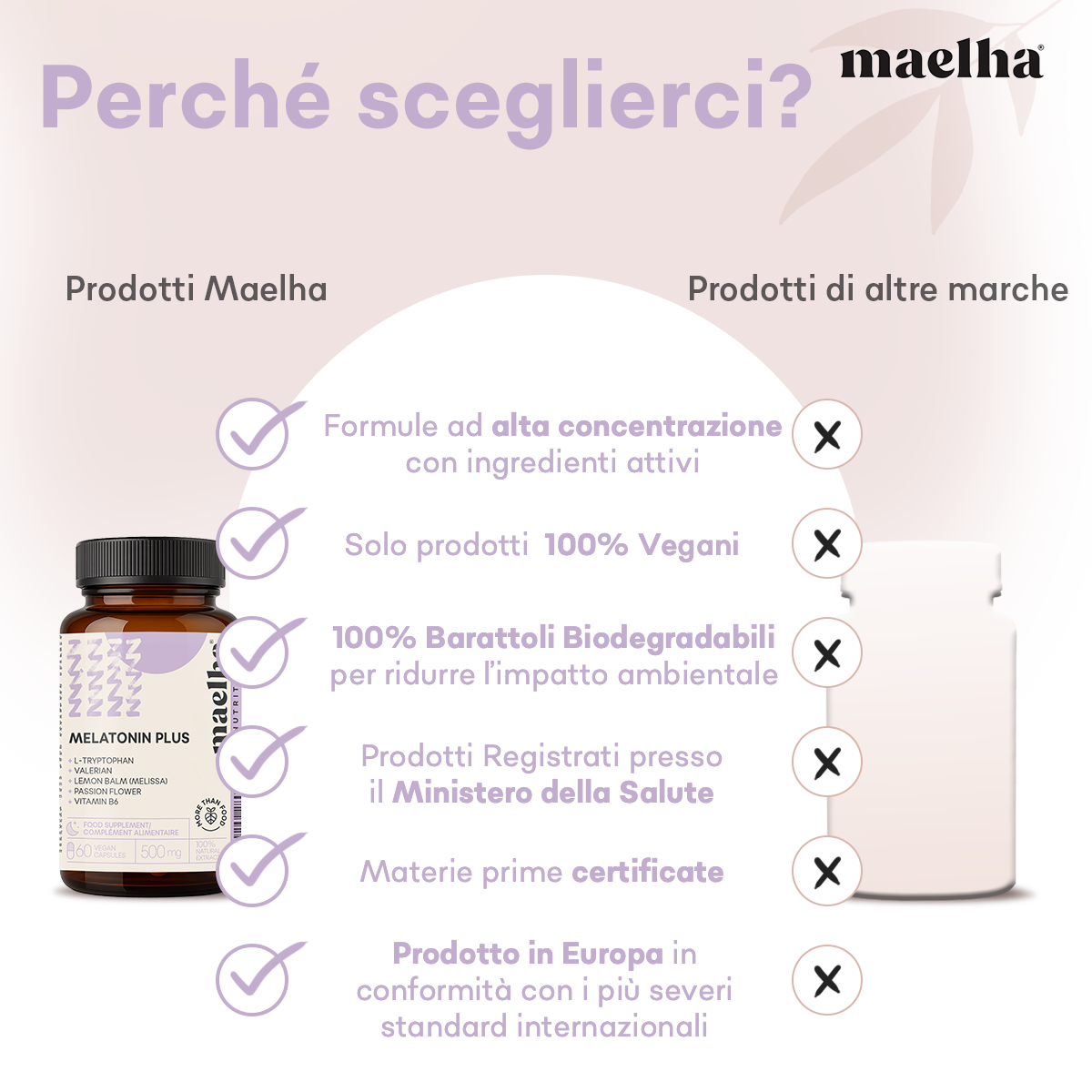 Integratore per il sonno 100% vegano. Qualità garantita da certificazione di produzione biologica conforme ai rigorosi standard ISO 22000 e GMP. Confezione 100% biodegradabile. Maelha rispetta l'ambiente ed è a favore della sostenibilità per un mondo plastic free.